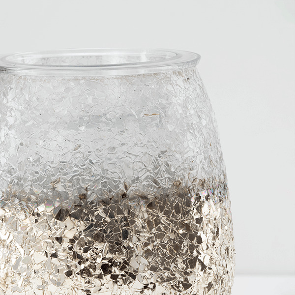 A nickel-plated finish adds extra glitz and glam to textured glass, while a metal base finishes the look.