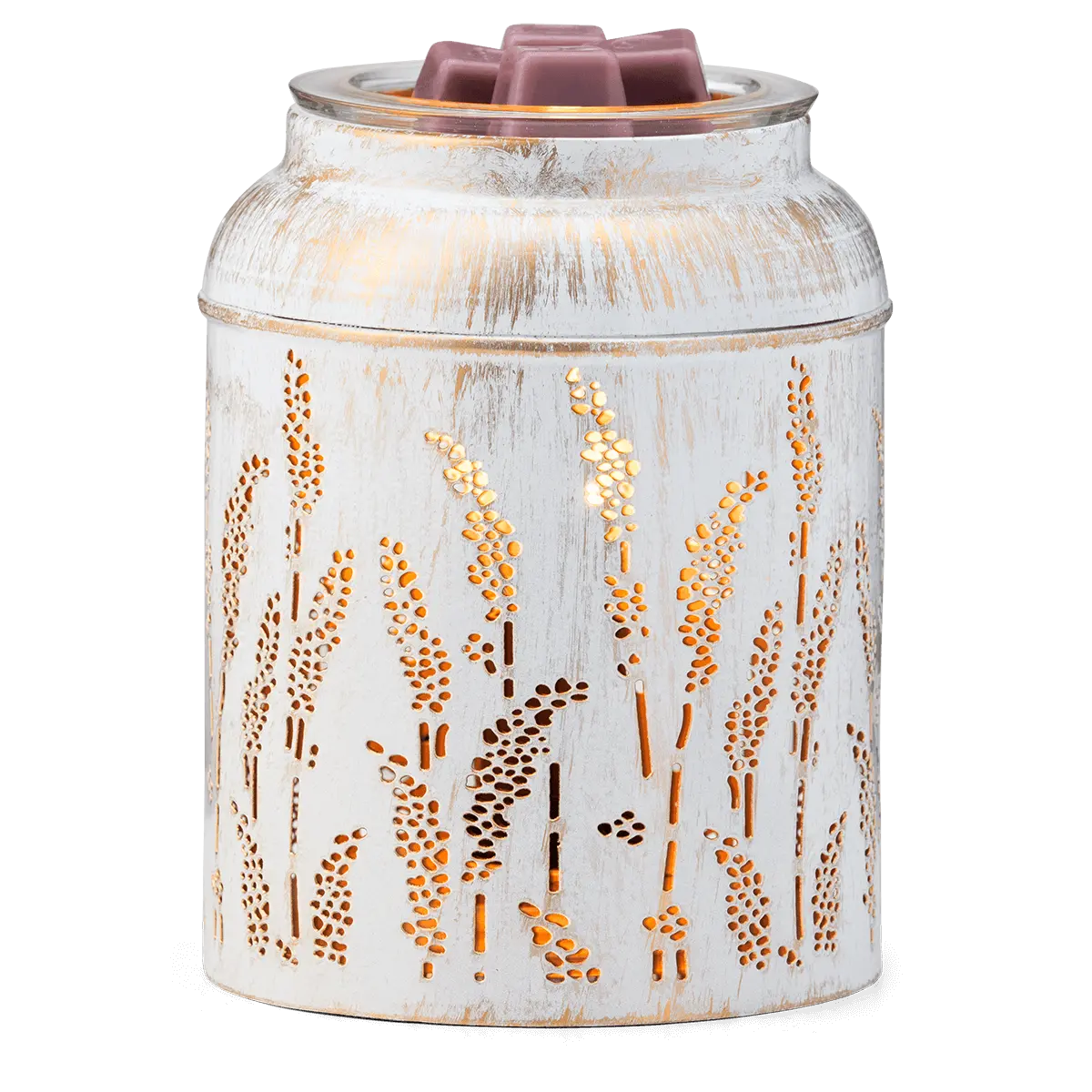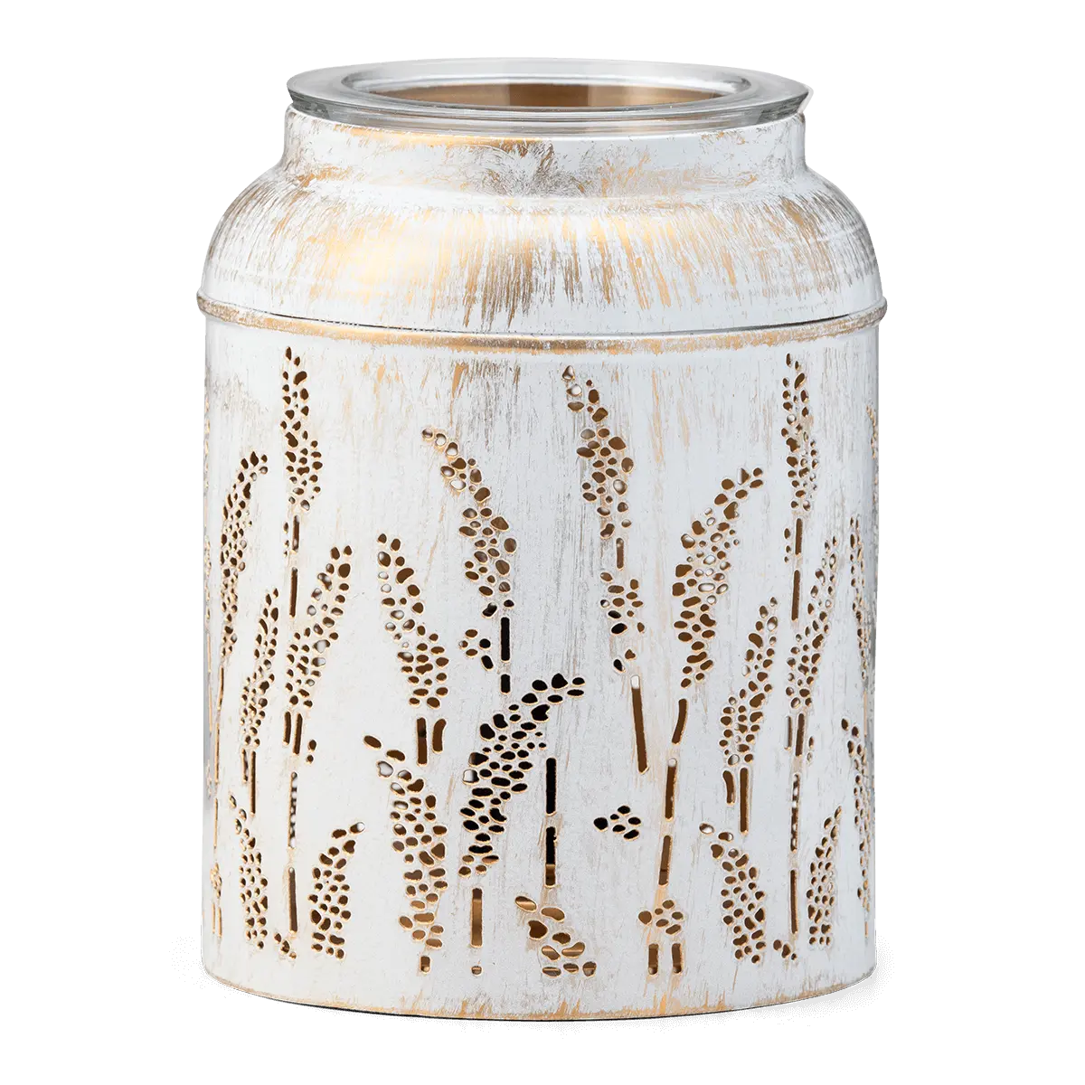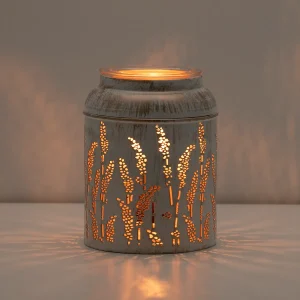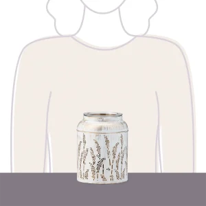 Harvest the light that radiates from within through a whitewashed, stamped metal exterior, creating a glorious glow when lit.