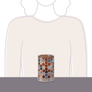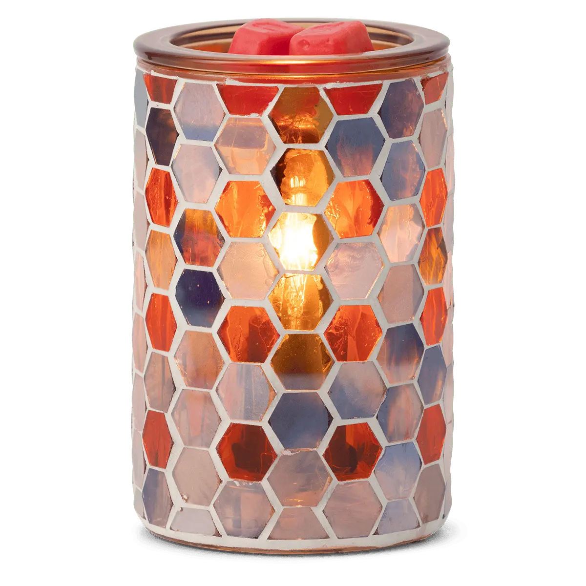 Each piece of glass on the Golden Oak Warmer is stained with a watercolor-style technique and hand-placed in a honeycomb pattern. No two are exactly alike.