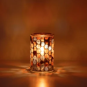 Each piece of glass on the Golden Oak Warmer is stained with a watercolor-style technique and hand-placed in a honeycomb pattern. No two are exactly alike.