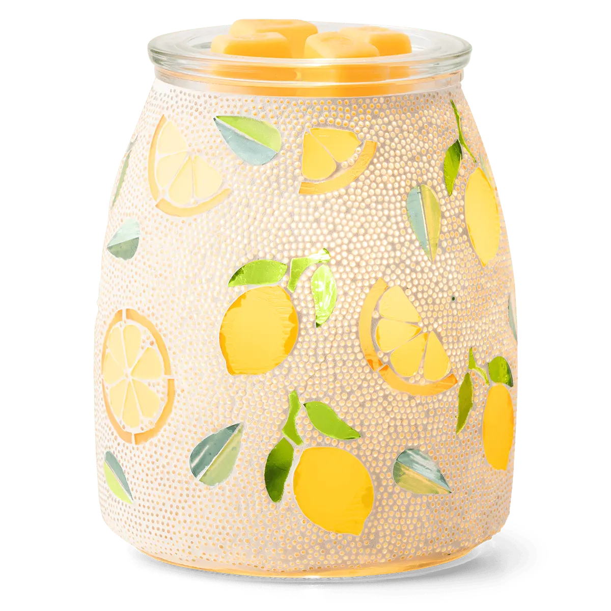 The zest is yet to come! A mosaic glass pattern of vibrant yellow lemons shines dappled light when lit.