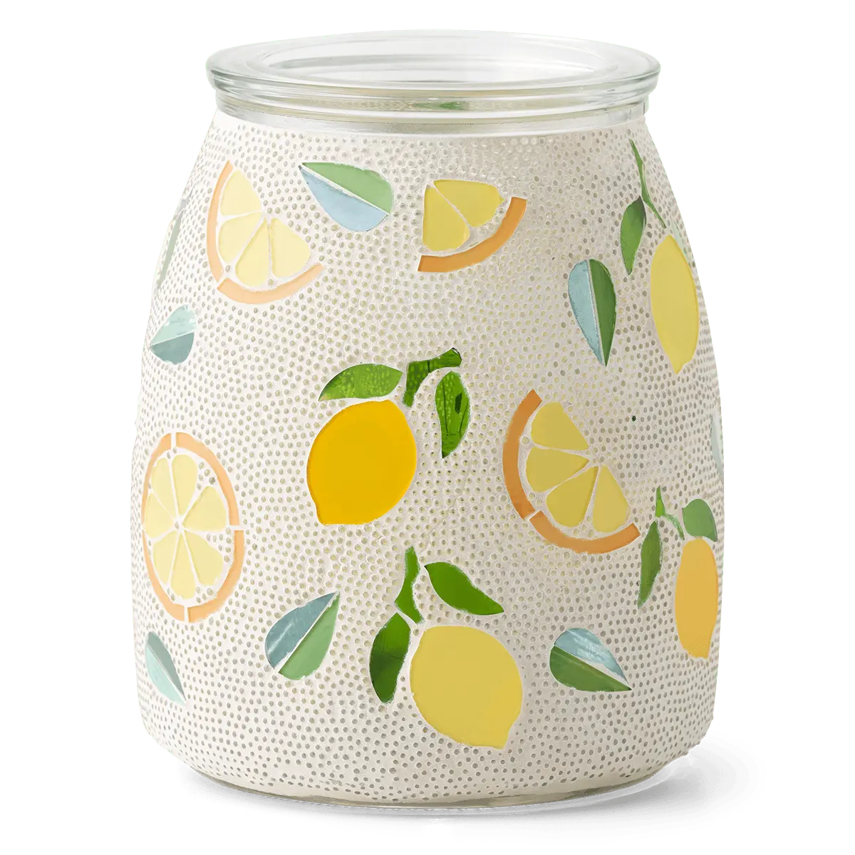 The zest is yet to come! A mosaic glass pattern of vibrant yellow lemons shines dappled light when lit.