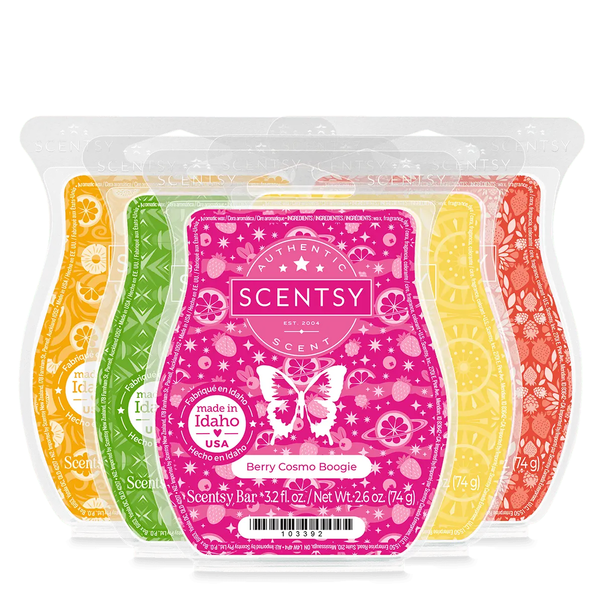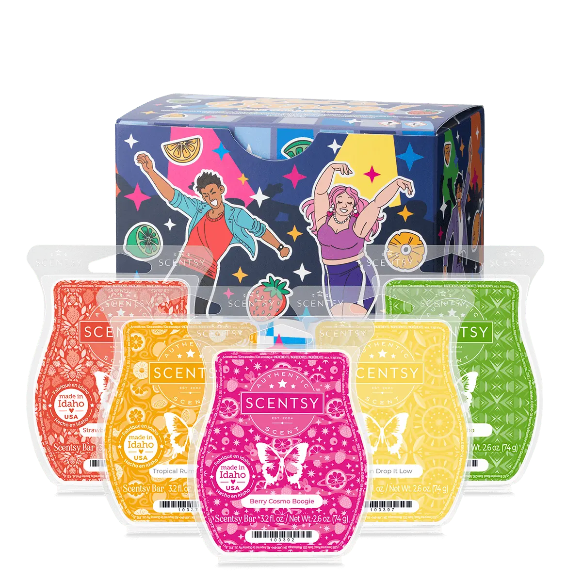 Start the music and hit the floor with fragrance inspired by refreshing drinks and classic dance moves. Includes one Scentsy Bar in each of the following fragrances packaged in a coordinating box:Berry Cosmo Boogie: Sugared grapefruit, white cranberry and raw sugar swing out with wild berries.Lemon Drop It Low: Candied lemon gets down, down to the ground, with sugar crystals and citrus leaves.Mojito Mambo: Sparkling club soda, crushed lime and muddled mint leaf sway away with white rum.Strawberry Daiquiri Disco: Strawberry puree, white raspberry and Caribbean rum turn the beat around.Tropical Rum-Ba Cooler: Passion fruit and pink grapefruit feel the rhythm next to pineapple juice and a hint of lime zest.Made of high-quality paraffin wax for long-lasting fragrance, Scentsy Bars are composed of eight break-apart cubes designed to use with any Scentsy Warmer. As the cubes melt, they fill your space with our exclusive scents, inspiring imagination and memories. Safe to use — no wick, flame, smoke or soot. Made in Idaho, USA. Net wt 2.6 oz.