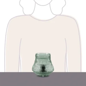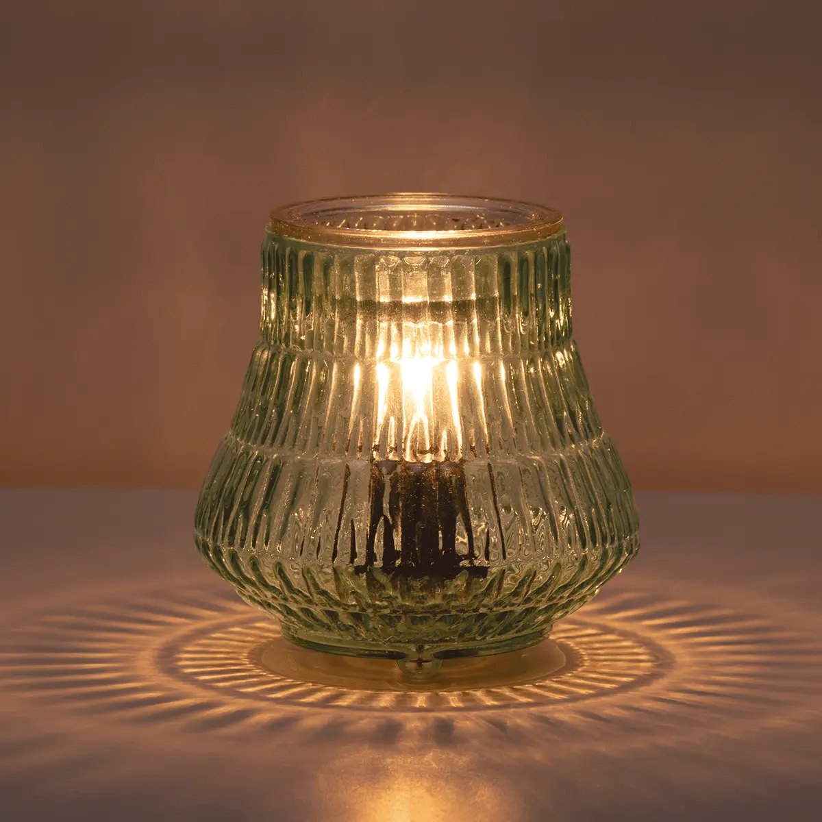 Light catches the intricate grooves of Moroccan-inspired, vintage-style glass and shines patterns on nearby surfaces when lit.