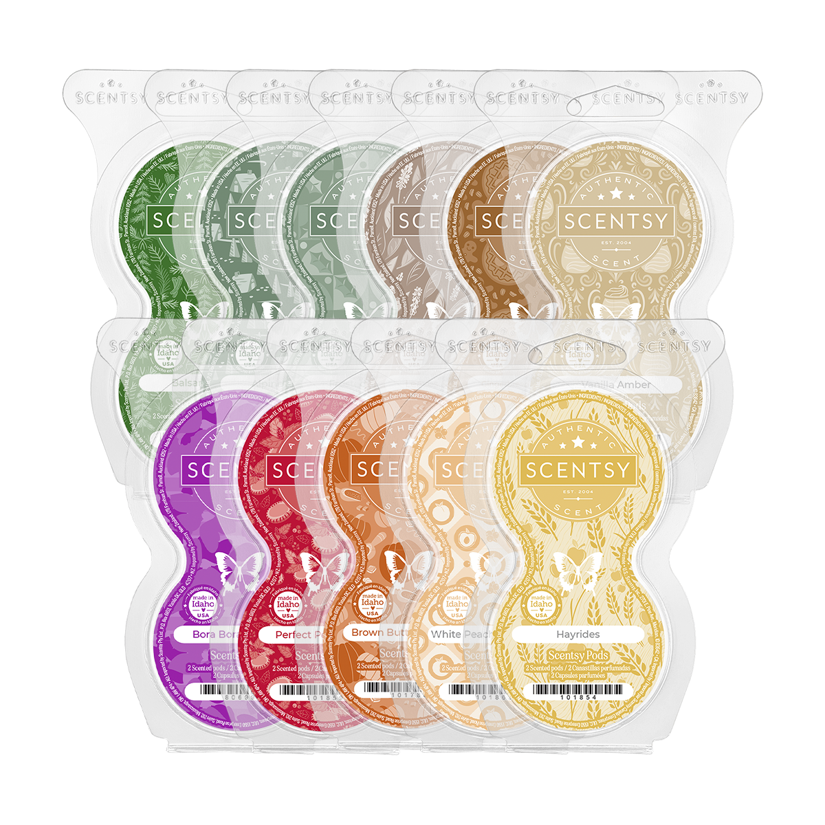 Welcome a new season with fragrance! Try all 11 scents new to Scentsy Pods in one convenient bundle. Includes one Scentsy Pod Twin Pack in the following fragrances:Alpine Escape: Feel a rush of minty air among spruce and evergreen trees on a scenic mountain getaway.Balsam Spice: Captivating cinnamon adds sweet spice to charred cedar and balsam.Bora Bora Blossom: Get lost in a balmy combination of succulent island fruits and lush orchid, balanced with a kiss of fresh, green violet leaf.Brown Butter Pumpkin: Whip up a batch of seasonal spice, mixing melted butter and brown sugar with pumpkin for a tempting treat.Frosted Fantasy: Notes of bergamot drift across snowdrop blossoms from a cedarwood cottage.Gingerbread Pecan Waffles: Savor all-day breakfast with warm and fluffy gingerbread waffles topped with molasses and roasted pecan.Hayrides: Climb aboard with fresh hay and cedarwood, and take a ride through crisp apple orchards in this ode to a joyful autumn tradition.Leaves & Lavender: Soothing lavender and a hint of clove wrapped up in fall leaves invite you to relax.Perfect Peppermint: Cooler than most. Pure peppermint is the popular kid you’ll love to love.Vanilla Amber: Rich vanilla cream and golden amber infused with sweet rum are a piece of pastry perfection.White Peach & Cranberry: A juicy bite of fresh-picked white peach with a tart touch of cranberry.Air flows through the Scentsy Pods and into the environment for immediate fragrance. The fragrance beads in the Pods release the perfect amount of scent for an incredible experience in your favorite Scentsy fragrances. Each Scentsy Pod provides up to 120 hours of fragrances.
