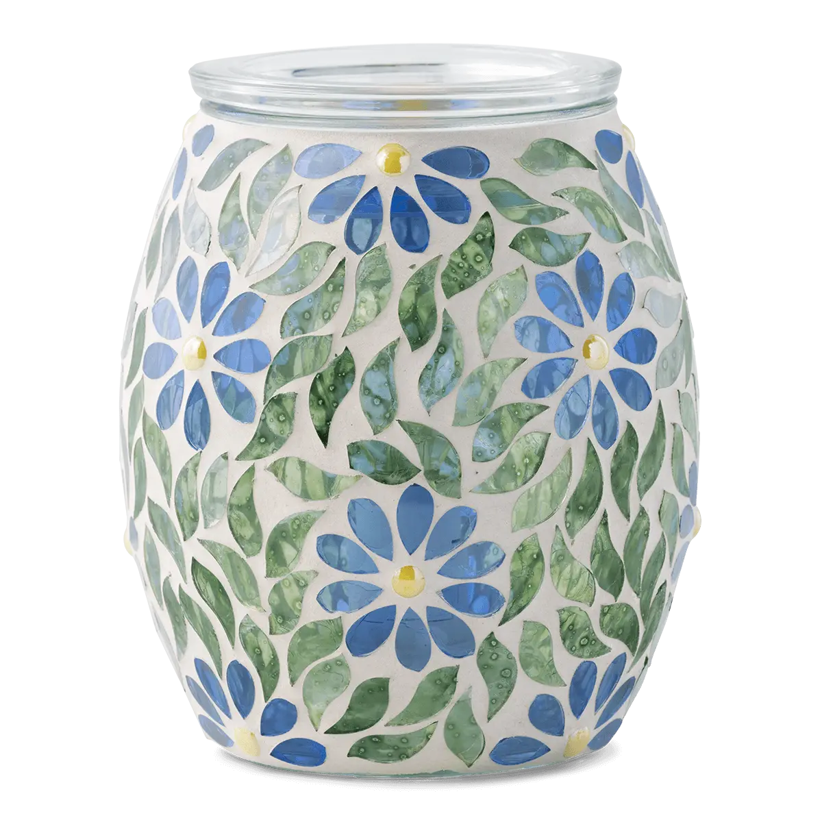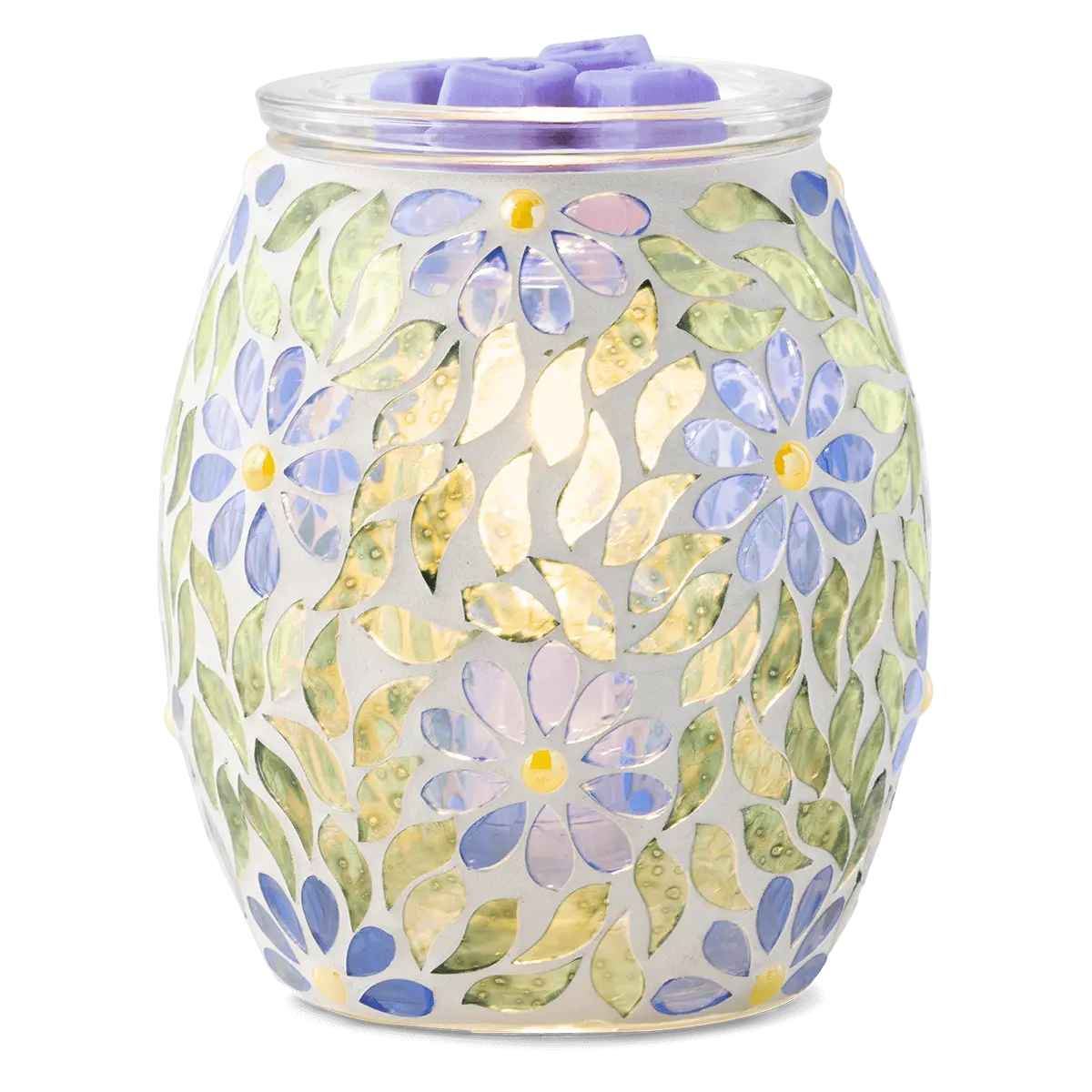 Spring flowers are always in bloom with this reflective mosaic. Transparent glass pieces are hand-cut and hand-placed, making each Warmer unique. Beautiful colorsshine on nearby surfaces when lit.