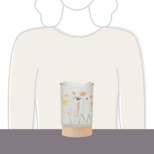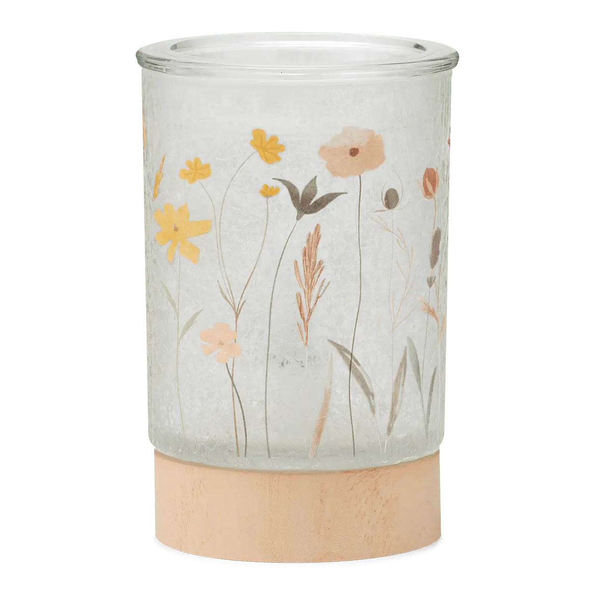 A delicate design reminiscent of pressed flowers preserves the beauty of a wildflower bouquet. A crystal texture and faux wood base finish the look.