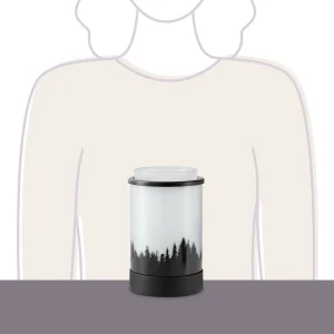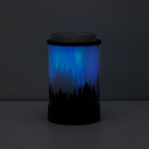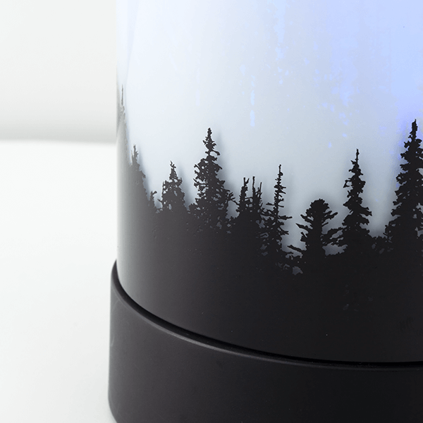 Enjoy the northern lights from anywhere! In an homage to nature’s greatest light show, rotating LED lights create a mesmerizing aurora borealis effect above the tree line. As in nature, this dazzling display is best visible in a darker environment.