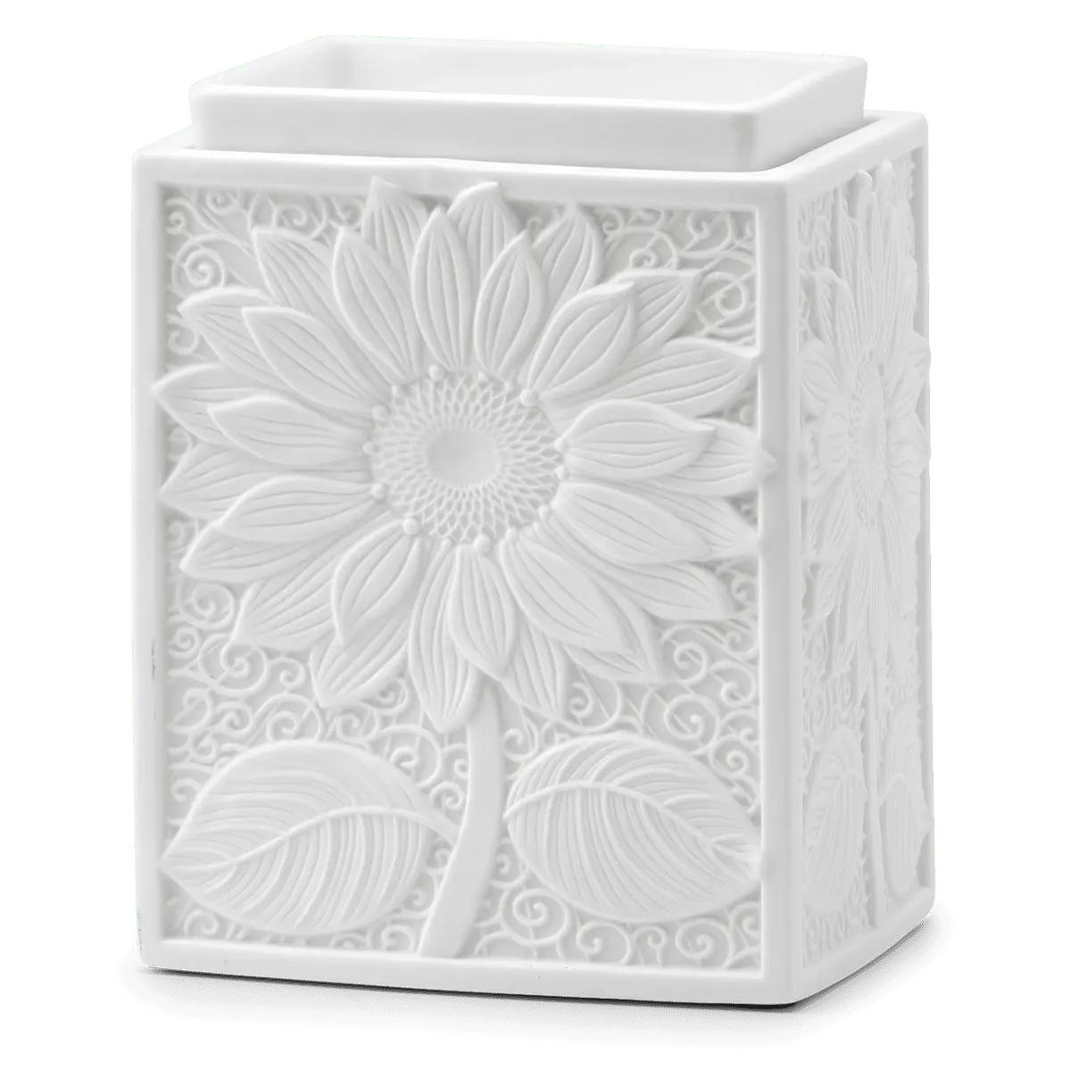A radiant sunflower embossed on pure white porcelain is simple joy personified.