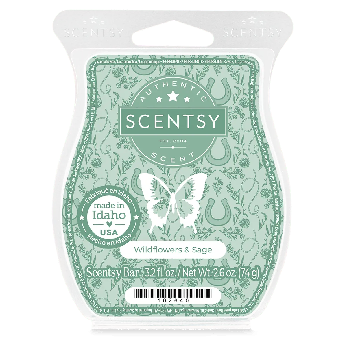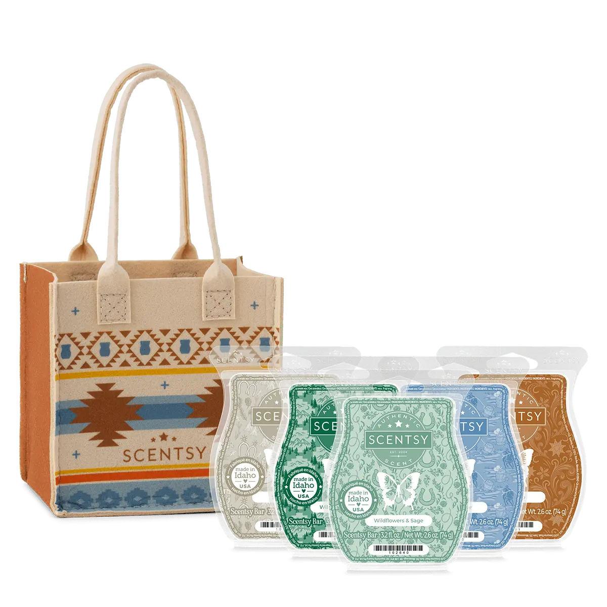 All five Wild Flowers & Wild Horses Collection Scentsy Bars in a felt tote inspired by the American West. Includes:Saddle Up: Capture some on-the-range reverie with soft suede, aged leather, sheer musk and a breath of fresh air.Silver Spur: Smokey campfire notes drift through groves of silver spruce and lavender.Whiskey River: Crisp rushing river undercurrents carry sweet notes of Golden plum and bourbon barrel.Wild Mountain Sky: Refreshing vistas of mountain pine, cypress, blue eucalyptus and fern sprig.Wildflowers & Sage: Bright meadows of wildflowers, fresh mint, white moss and sage leaves.Made of high-quality paraffin wax for long-lasting fragrance, Scentsy Bars are composed of eight break-apart cubes designed to use with any Scentsy Warmer. As the cubes melt, they fill your space with our exclusive scents, inspiring imagination and memories. Safe to use — no wick, flame, smoke or soot. Made in Idaho, USA. Net wt 2.6 oz.